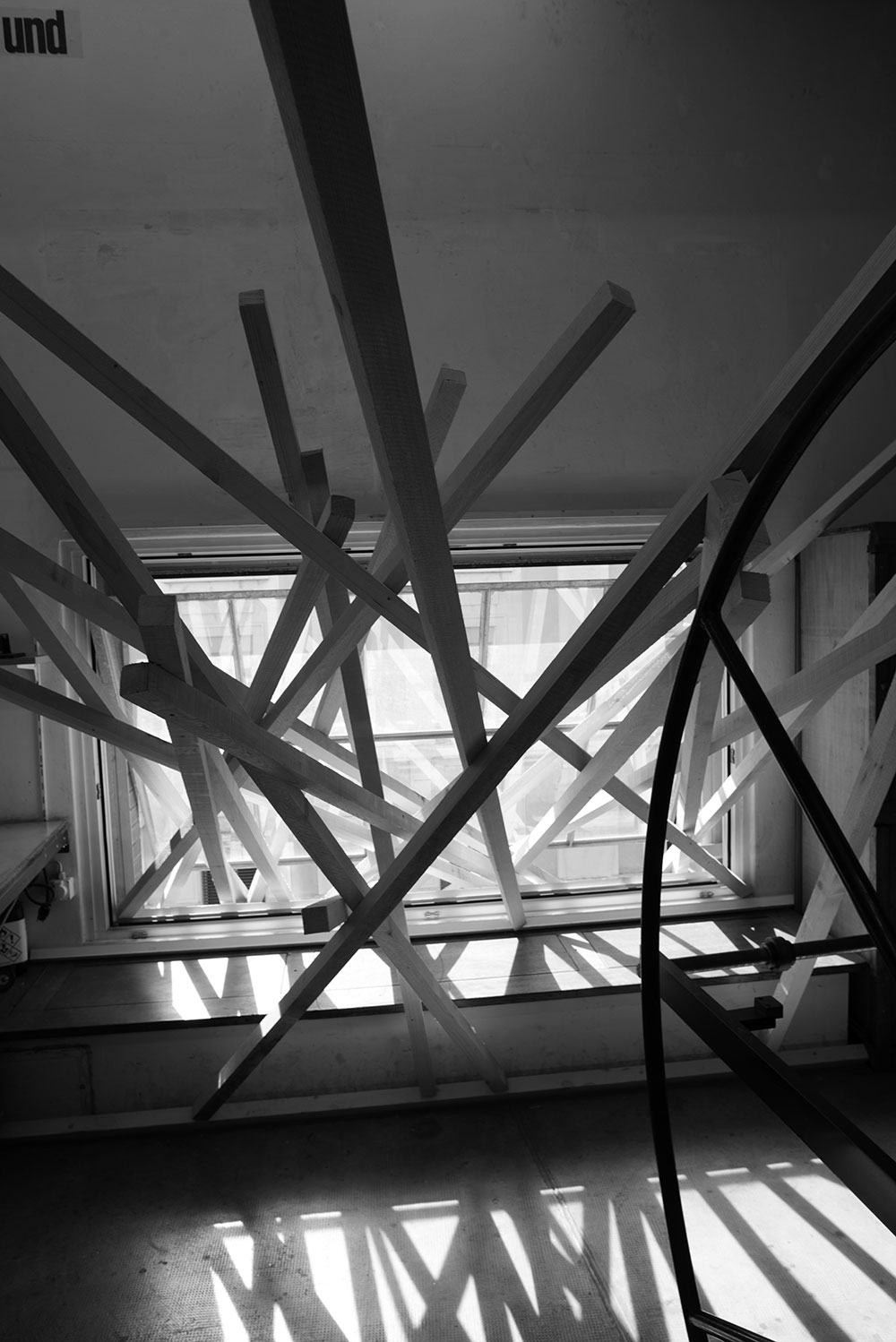 Progetto site specific collocato in una stamperia, l’opera si struttura sul conflitto fra esterno e interno in rapporto al flusso dell’informazione di cui l’edificio è generatore e ricettore. Un cumulo di segmenti di legno straripa da una finestra e la ottura, da qui il titolo overflow, termine usato per indicare l’eccesso di dati, la saturazione dei supporti usati per stoccare le informazioni. Questo insieme satura l’apertura elidendone le funzioni. Una finestra da cui è impossibile comunicare verso la strada e gli edifici vicini, un punto di vista privilegiato sulla città da cui è impossibile vedere alcunché.